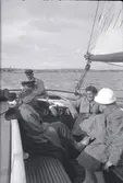 Bildtext till kopian i fotoalbumet: "Badgästsegling 1932. Båt: Nordstjernan. De svartklädda damerna i sittbrunnen är: Charlotta Johansson f. 1868 och "Sannes Emma" från Östersidan. Skeppare Karl Johansson f. 1898. Gast: Mats Wångblad f. 1918. Övriga badgäster".