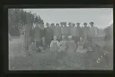 "Rökärr, Fogelstad." Grupporträtt av ett arbetslag på en åker/ äng. Männen står lutade mot sina liar.