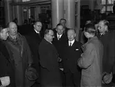 Överbibliotekarie Anders Grape "på Carolina Rediviva demonstrerar faksimilupplagan av Codex Argentus" för tyska pressmän inbjudna av Utrikesdepartementet