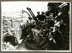 Bilden visar en grupp sjömän på däck av ubåten Valen till sjöss.
