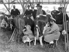 TRE KVINNOR OCH EN MAN MED KOR PÅ LADUGÅRDSBACKEN