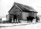 FAMILJ FRAMFÖR SITT TIMRADE BOSTADSHUS. EN KO BETAR VID STUGKNUTEN.