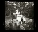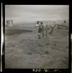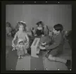 Två flickor drar ett litet barn, som sitter i en låda vilken fungerar som en pulka, längs en landsväg.