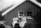 Tre kvinnor, fyra barn och en hund sitter i S:t Eriks park, Marstrand.