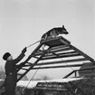 Bränder i Norra Möckleby september 1958. Undersökande poliser med polishund.