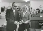 Postexpeditionen har haft besök av bl a postdirektionen i Stockholm Distrikt. Närmast distriktschefen Ebbe Bringert, t.v., och överkontrollör Gunnar Lagerberg samt i fonden överkontrollör Harry Wallin (från Stockholm Ban)t.v., och överkontrollör Sven Lidén.