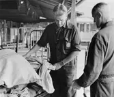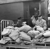 Paket lastas in i möbelbuss från Årsta Bilexpress. Längst till höger förste kontrollör Gunnar Lagerberg och andre från höger postassistent Åke Sjögren, båda från postdirektionen i Stockholms D.,hjälper till med lossning och lastning. Tredje från höger är Rune Lindqvist, K Gps.