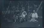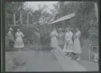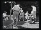 Ett sällskap sitter ute och fikar i en trädgård.