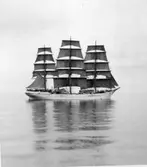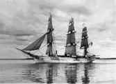 Marinens skolfartyg Gladan ligger till ankars utanför Falmouth England. Fartygsporträtt framifrån med hissade segel. Från styrbordssidan närma sig en slup som seglas av två personer. I bakgrunden syns Cornwalls kust.