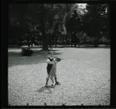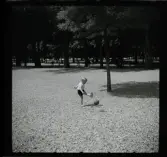 Flickor och pojkar spelar krocket ute på gården, sannolikt i Sverige