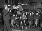 Filosofie magister Torsten Lagerstedt demonstrerar en luftvärnskulspruta för studenter på Södermanland-Nerikes nation, S:t Olofsgatan 16
