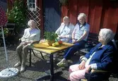 "Göteborgs studiecirkel" är på utflykt och fyra kvinnor sitter och fikar utanför Vommedal Östergård 2:90 "Olas", 1990-tal. Från vänster: Maj-Britt Björkman, Greta Nilsson och Asta Carlsson. Okänd kvinna till höger. Relaterat motiv: A2942.