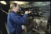 Ingvar Jörpeland med kollegor bredvid modellen av Vasa i skala 1:10. Jörpeland utförde skulpturerna till modellen i cernitlera.