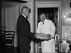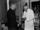"Kirurgins snabba frammarsch har ej tappat tempot" - avtackning av professor Gunnar Nyström, Akademiska sjukhuset, Uppsala maj 1942. Överläkare Anders Westerborn överlämnar en present