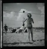 Flickor och pojkar spelar krocket ute på gården, sannolikt i Sverige