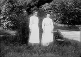 Två män med spadar. Ekonomibyggnad i bakgrunden.