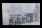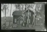 "Skoga, Valfrid Eriksson, Alvar o Ingrid." En familj framför sitt hus.