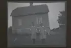 "Dammkärr, Stina och August Karlsson, Stina och Ingrid, Fogelsta" En familj framför sitt hus.