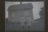 "Greta och Ingrid Jansson, Roshill, Äsköping." Två flickor poserar framför ett hus.