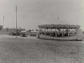 "Sandbergs Tivoli. Uppställt på grusplanen söder om Nöjesparken, Påskberget, Varberg. Platsen kallades 'Sahara'." Bilden visar ett par åkattraktioner och bodar.