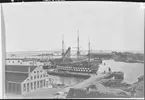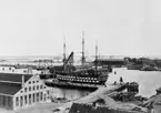 Bilden visar linjeskepp Stockholm nedriggad som logementsfartyg liggande vid s.k. polispiren i Karlskrona. I föregrund syns Tårarnaspark, Kungsbron vid Bastion Aurora.