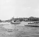 Vårreportage. Studentpar på bänk på Gröna Lund första, maj 1958. Människor och åkattraktioner i bakgrunden.