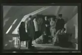 En manlig och en kvinnlig skådespelare in action på scenen. I bakgrunden ses en annan kvinna, troligtvis i gamla Teaterhuset (i gamla Missionskyrkan), okänt årtal.