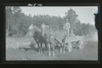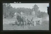 Ekonomibyggnad i vinkel med halmtak tillhörande Storskogen, Ravelsmark. En skrinda och en arbetsvagn står på gårdsplanen. Centralt placerad tröskvandring. Ett stort lövträd till vänster i bild.