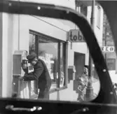 Värdebrevbärare vid postkontoret Stockholm 1, 1940 - 1942. Till höger synes blecklåda med penningar, postanvisningar och giroutbetalningskort. Mars 1942.