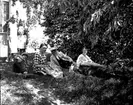Picknick under Arbogautställningen 1935. Sju kvinnor och en man sitter på mattor utlagda i gräset. Avkoppling i Ahllöfsparken/Olof Ahllöfs park nära Arbogautställningen. De har kafferast i förberedelsearbetet inför utställningen. Från vänster: Sven Drakenberg (intendent), Britta Orén, Olga Anderzon (från hemslöjdsföreningen), okänd, längst bak, i hatt, Hanna Hartelius, Ulla Hermansson, Augusta Eriksson och Elin Höglund (konstnärinna) Bildens baksida, se AKF-14500 Bilden är tagen av fotograf Blom i Västerås (förnamn saknas)