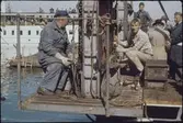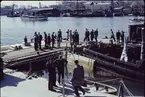 Foto från bärgningen av last-& passagerarångfatyget "BORE" av Åbo, som på resa Åbo-Mariehamn-Stockholm grundstötte den 31/12 1899 vid Alskär (Gräskö) nära Kapellskär mellan Söderarm och Furusund och sjönk 1/1 1900 å 15-20 famnars djup. Bärgad av Neptunbolaget 1900-04-26. På fotots mitt BORE samt på sidorna pontonerna ODEN och FRIGG.
