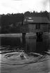Badande barn vid en sjö. Vid stranden ligger en liten bod och vid den står en vuxen man. Kanske är det vid någon barnkoloni.