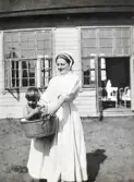 "Syster Greta med sin älskling." Greta står utanför en av Kustsanatoriets paviljonger med ett litet barn i löddrande badbalja av zink.