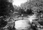 Ett fartyg vid sluss i Sjötorp längs Göta kanal. En ledfyr till höger i bild.