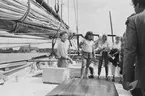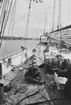 Personal ombord på PRIDE OF BALTIMORE. I knät hos en man vilar en kattunge.