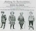 "Gosskläder - tillverkade å egen atelier af goda, lämpliga tyger, samt efter nyaste modeller." Fyra olika modeller av barnkläder. K.M Lundberg Katalog.
