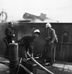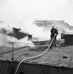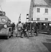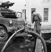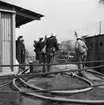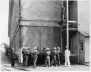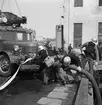 Bilden visar brandmän från brandkåren i Karlskronas örlogsvarv som har tagit uppställning för en gruppfoto framför sin brandbil och brandstationen.