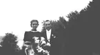 Brudpar, bruden helt i vitt med slöja, brudbukett, brudgummen i mörk kostym. Ragnar Ring