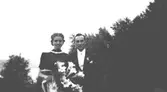 Brudpar, bruden helt i vitt med slöja, brudbukett, brudgummen i mörk kostym. Ragnar Ring