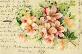 Notering på kortet: Blomsterspråket IX. Ros, Vit: Oskuld. D:o Röd: Jag älskar dig! D:o gul: Svartsjuka. D:o Moss: Var som denna ros utan törnen!