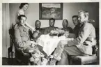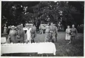 "Även 5:e kompaniet stod på god fot med civilbefolkningen." Några glada mannar eskorterar några medelålders kvinnor till ett uppdukat kaffebord utomhus. I bakgrunden skymtar några lastbilar, där man också kan skymta några ur lokalbefolkningen.