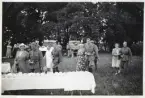 "Även 5:e kompaniet stod på god fot med civilbefolkningen." Man har arrangerat kafferep utomhus. I bakgrunden syns bl a några magasin.