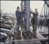 Transport av PM2 yankeecylinder på pappersbruket Papyrus i Mölndal, 12/4 1957. Cylindern lyfts av från släpvagnen.
