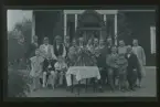 Medföljande text: "Fotografi taget i anledning av J W Bergs 60-årsdag 1945 på trappan utanför hans hus. 1. Lennart Berg, yngste son till J W Berg, 2. Elon Johansson, 3. Johansson (Nordensjö), bror till 33:s fru, 4. Östen Berg, son till J W Berg, 5. Åke Johansson (Wallsten), bror till 3, 6. Bertil Kristiansson, svetsare, ordf. i fackf. 7. Valter Berg, son till J W Berg, 8. Ingmar Kristiansson, 9. Agne Hilmersson, svarvare, 10. Karl Lennart Karlsson, montör, 11. Folke Olofsson, svetsare, kusin till 33, 12. Harry Skog, Borlänge (ej på Bergs, gift med J W Bergs dotter), 13. Hjalmar Hermansson, timmerman, kom från Tjörn, 14. Adolf Andersson, timmerman, 15. Johan Wiktor Berg, direktör, 16. Sven Pettersson, svetsare, 17. Josef Olsson, drivare, 18. Oskar Olofsson, timmerman, 19. Bertil Gustavsson, svarvare, 20. Okänd, 21. Sven Olsson, drivare; son till 17, 22. Manfred Andersson, 23. montör, 24. Okänd, 25. John Svensson, 26. Oskar Jansson, 27. Mauritz Johansson, timmerman, 28. Arvid Olsson "Drivar-Arvid", drivare, 29. Sven Olsson, 30. Okänd, 31. Allan Alhberg, timmerman, 32. Okänd, 33. Erlend Andreasson, montör, 34. Oskar Karlsson, sågare, 35. Lindberg, fru till 44, 36. Harry Andersson, timmerman, flyttade till Småland, 37. äldsta dotter till J W Berg, gift med 12, 38. Henning Eriksson, gjutare, 39. Folke Karlsson, snickare, 40. Karl "Sme-Kalle" Gustavsson, smed, 41. Eisten Sjödell, snickare, 42. Fredrik Klar, timmerman, 43. Sigvard Olofsson, montör (propellrar), 44. Lindberg, bokhållare, 45. Almén, svarvare, 46. Alfred Olsson, snickare, 47. Johan Sundberg, svarvare, 48. Albin Ahlberg, montör, 49. Karl Hilmersson, målare, 50. Martin Johansson, timmerman, 51. Algot Pettersson, körde timmerbåten, 52. Torsten Almqvist, montör, 53. Adel Svenningsson, montör, farbror till 67, 54. Harry Karlsson, timmerman, 55. Albert Johansson, kom från Bleket, Tjörn, kallad Blearn, 56. Okänd, 57. Johan Olsson, sågare, (skötte ramsågen), 58. Verner Almqvist, 59. Reinold Olsson, 60. Karlsson (Solbräcke), kom från Eriksberg våren 1945, 61. Karl "Nilsson" Gustavsson, plåtslagare, 62. Hjalmar Ahlqvist, 63. Torsten Österberg, 64. Olle Berg, svarvare, sedan kontoret, brorson till J W Berg, 65. Okänd, 66. Okänd, 67. Oskar Svenningsson, timmerman, kom från Knippla, förman på Björkö. Ägare till bilden: Östen Berg, Hälsö. Uppgiftslämnare: Östen Berg och Erland Andreasson, Hälsö.