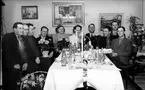 Bror "Petter" Pettersson firar sin 40-årsdag tillsammans med familjen och arbetskamraterna "sömmerskorna" i hemmet på Gamlehagsvägen 17 i Torrekulla den 18 maj 1953. "Petter" arbetade som skräddare på Bergströms herrekipering i Göteborg. Relaterat motiv: 2023_0149.