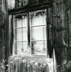 Gavelspets på opanelad stuga med torvtak. Observera de höga vindskivorna.