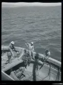 Helmer Garthmans jobbkompisar, från API, är ute med båt och fiskar. Näset, 1950-tal.