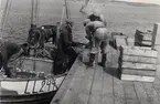 Enligt noteringar: 70 st. ramade dia. + 5 st. burkar med oramade dia. Båtar, Varv, Hav, Människor. Film nr. 123 Öckerö hamn. obs. Slipstenen på skutmaskinen* för knivslipning.