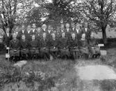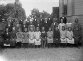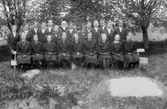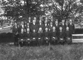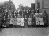 "1931. 56. Komminister Andreasson i Hede, Bohuslän omkring år 1931." "Komminister John Andreasson tjänstgjorde 1930-39. Konfirmation i Hede kyrka i maj 1931. Stående från vänster: Gustav Karlsson (på Vigeröd). Sven (på Huken). Verner Andersson. Johan Svensson. Komminister John Andreasson. Ivar Ahlström. Henry Hansson (på Stensryr). Hilding Fröjdendahl (på Storskogen). Karl Johansson (på Mon, Sälelund). Sittande från vänster: Hanna Olausson (syster till Johan på Kullen, Långön). Lilly Karlsson (på Hällan). Maria Olsson (på Synneröd). Hilda Olsson (på Hult). Edit Ottosson (i Fisketorp). Ester Alfredsson (på Stensryr, gift med Enar Karlsson på Hällerna under Hede i Foss socken)."