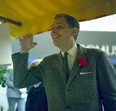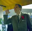 Götlin, 30 september 1965 I förgrunden står står en man klädd i ljus kavaj, vit skjorta med svart fluga till. Han bär glasögon och är fotograf. I sina händer hållar han ett fotografi föreställande en ung flicka som håller en bok i famnen. Bredvid honom till vänster på bilden står en stor kamera och bredvid den ytterligare en kamera som är mindre i storleken. Ytterligare fotoutrustning finns i fotoateljén. På väggen hänger ett tygstycke med texten "Lions...". Ytterligare foton hänger på väggen till höger.